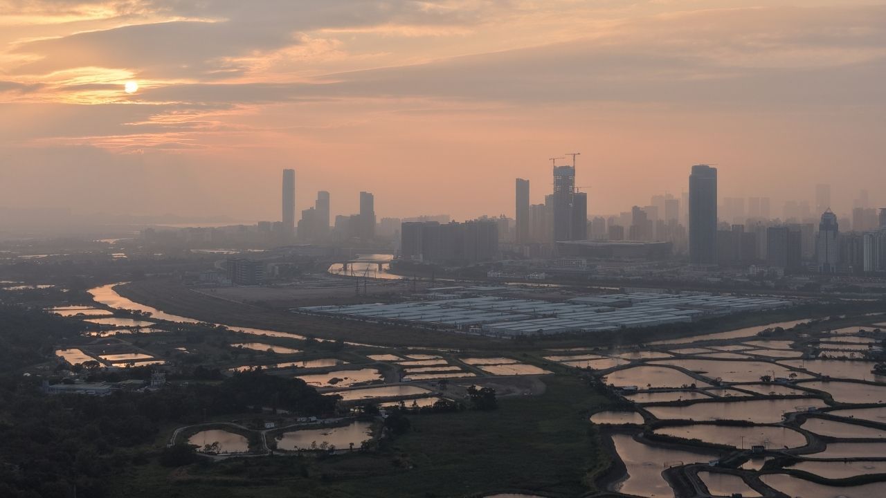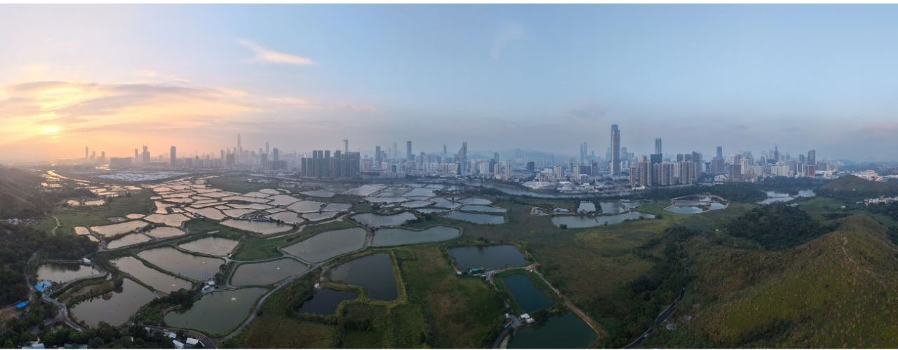 2023年9月の本コラム(第33回)で、私はこの場所を「逆転の風景」と紹介しました。目の前に広がるのは、摩天楼が林立する近未来都市・深センと、手前に広がるのどかな香港側の養殖池。