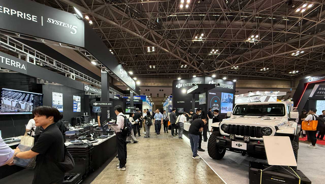 DJI JAPANの向かい側には、同社製品を販売するシステムファイブもブースを構えていた。最新の産業ドローン「DJI Matrice 400」を展示し、関心を集めていた。DJI Dock 3も設置されともに運用するドローン「DJI Matrice 4TD/4D」も紹介されていたが、その機体上部には見慣れない半球状の機器が取り付けられていた。これはDJI Matrice 4シリーズ用のLiDARだ。