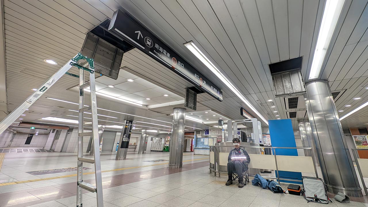 OJTは地下鉄営業が終わったあとに行われた。向かったのはOsaka Metroなんば駅。御堂筋線、千日前線、四つ橋線が交差するジャンクションだ。各線の最終電車へと急ぐ人々を見送ると駅構内から人気がなくなり、清掃員がかける掃除機の音が響くだけになった。これから始発が発車するまでの約3時間で、マイクロドローン点検を行っていく。