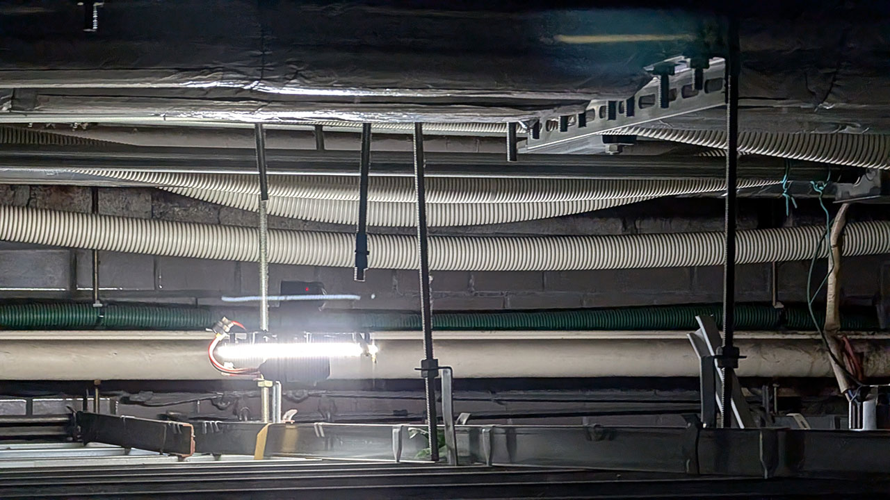 ここで改めて駅の構造について解説したい。地下駅はコンクリートでできた構造物であり、その中に天井仕上げ材が懸架されている。我々が天井だと思っているのがこの天井仕上げだが、その裏側には、コンクリート構造物との間に空間が生じている。この空間内には、100Vや200Vの電源ケーブル、光ファイバーケーブル、インターホンや防犯カメラ用の配線などが張り巡らされている。また、大きさの異なる配管や、天井仕上げ材を吊るす吊りボルトなどが無数にあり、複雑な環境だ。
