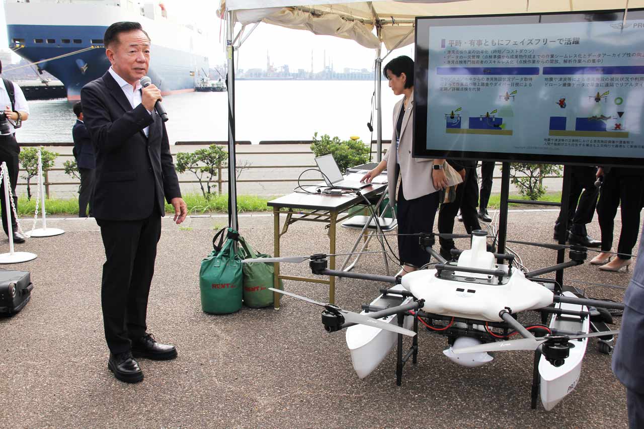 9月24日、屋外の会場で水空ドローンの飛行デモを実施した。補助金などを通じてスタートアップの研究を支援する政府の事業・SBIR制度を活用し、KDDI総合研究所と開発を進めている。河川や港湾の状態監視保全を実現することを目標としており、機体の大きな特徴が「着水」と「水中ドローンの搭載」だ。つまり、水上の目的地まで飛行して着水。その後、機体に搭載されている水中ドローンを発進させ、海中の状態をリアルタイムで観察する。戸谷俊介社長は本機を使うメリットを力説する。