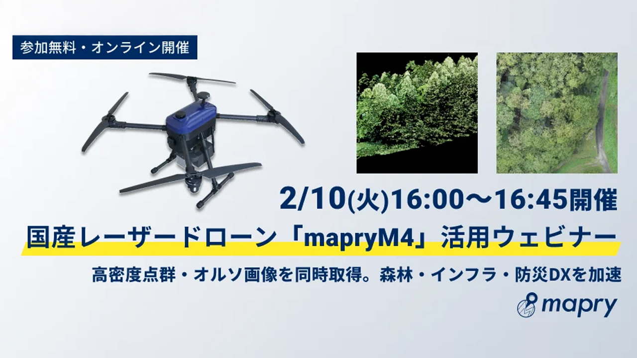 1フライトで点群+オルソを同時取得 マプリィ、国産レーザードローンmapryM4の活用ウェビナーを2月10日に開催